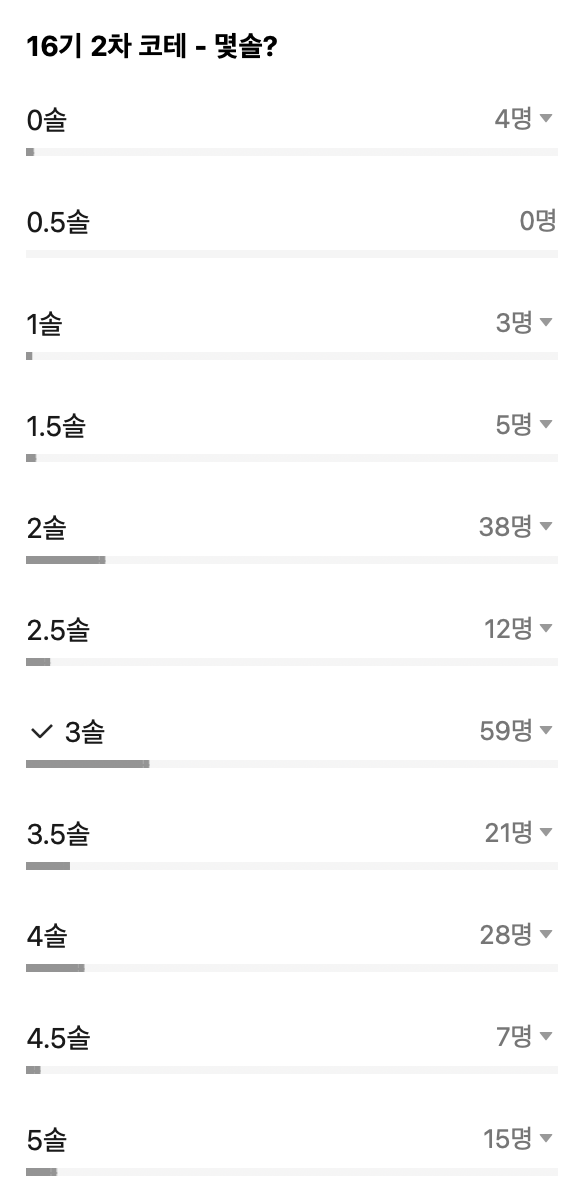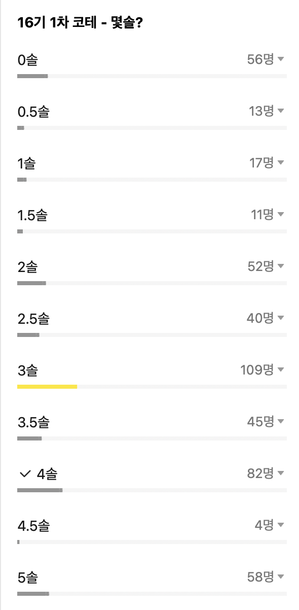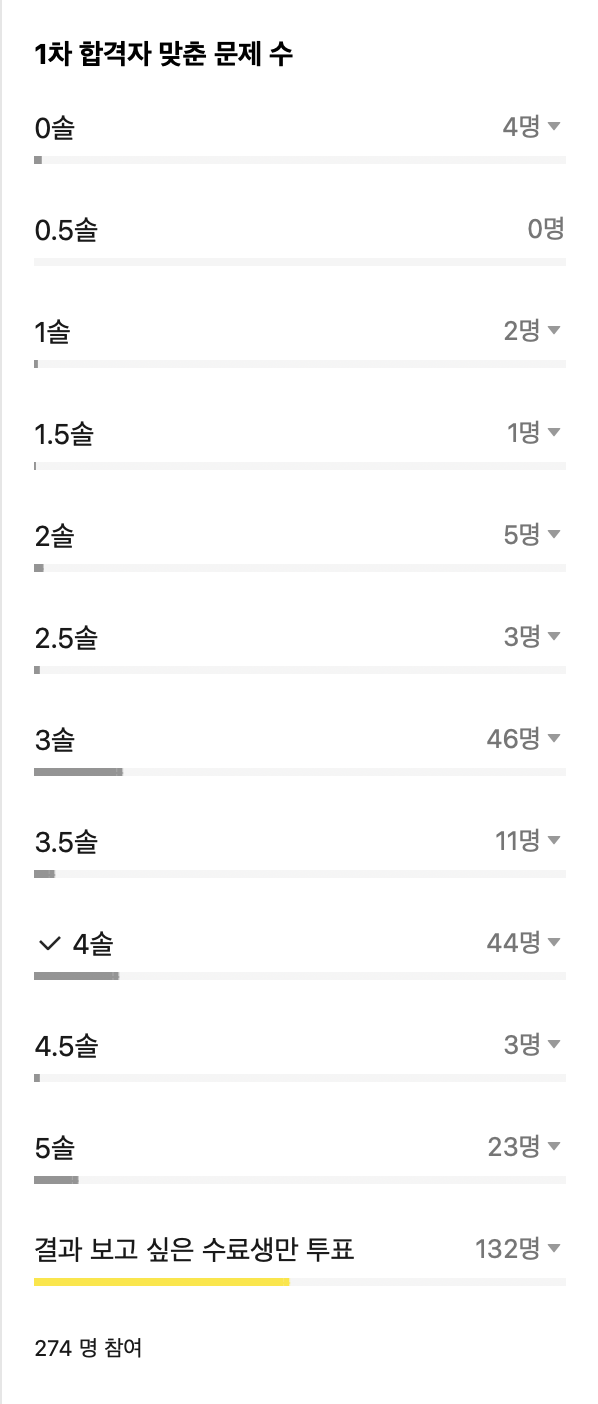 이렇게 톡방에서 3,4솔이 가장 많았고, 합격자도 특별한 경우가 아니면 3솔인 듯 합니다.