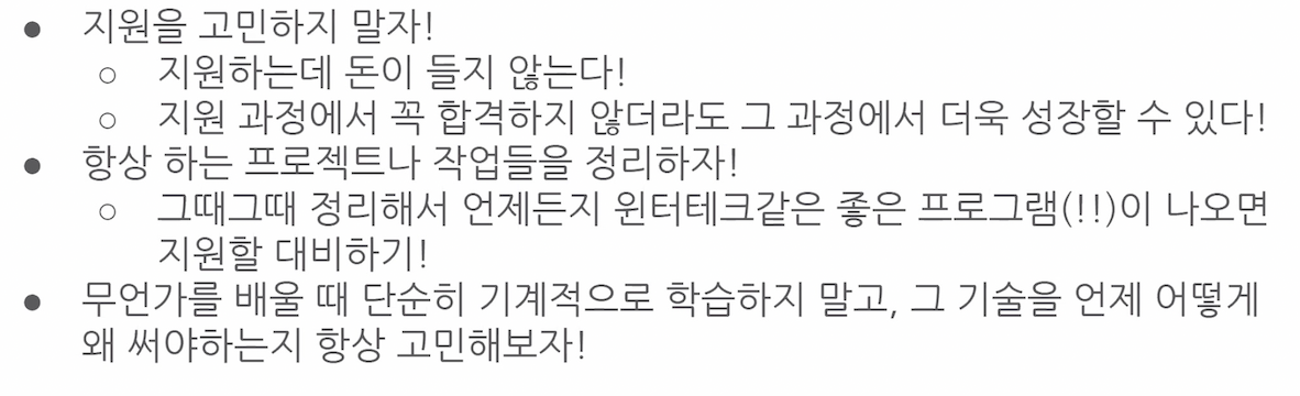 작년 썸머테크를 통해 입사한 분의 팁 중 "지원하는데 돈이 들지 않는다!"가 특히 마음에 들었다. 합격하지는 못하더라도 그 과정 하나하나에 많은 것을 배울 수 있을 것이고, 그 과정은 내가 치뤄보지 않았더라면 절대 "남의 글"로만은 얻을 수 없을 것이다. 그리고 이 슬라이드가 올해 내 인생을 바꾸었다.